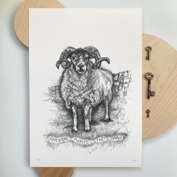 A drawing of a handsome Hebridean ram, from a Croft in Lewis. Translated onto paper as a graphite drawing with words ‘Adventure Awaits The Brave’ inscribed.