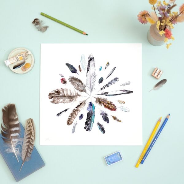 A fine art giclée print of an original Japanese watercolour and graphite pencil on canvas artwork I created of all the feather I either found or was gifted, by my children, my dad, my family and friends, in the year of 2022.