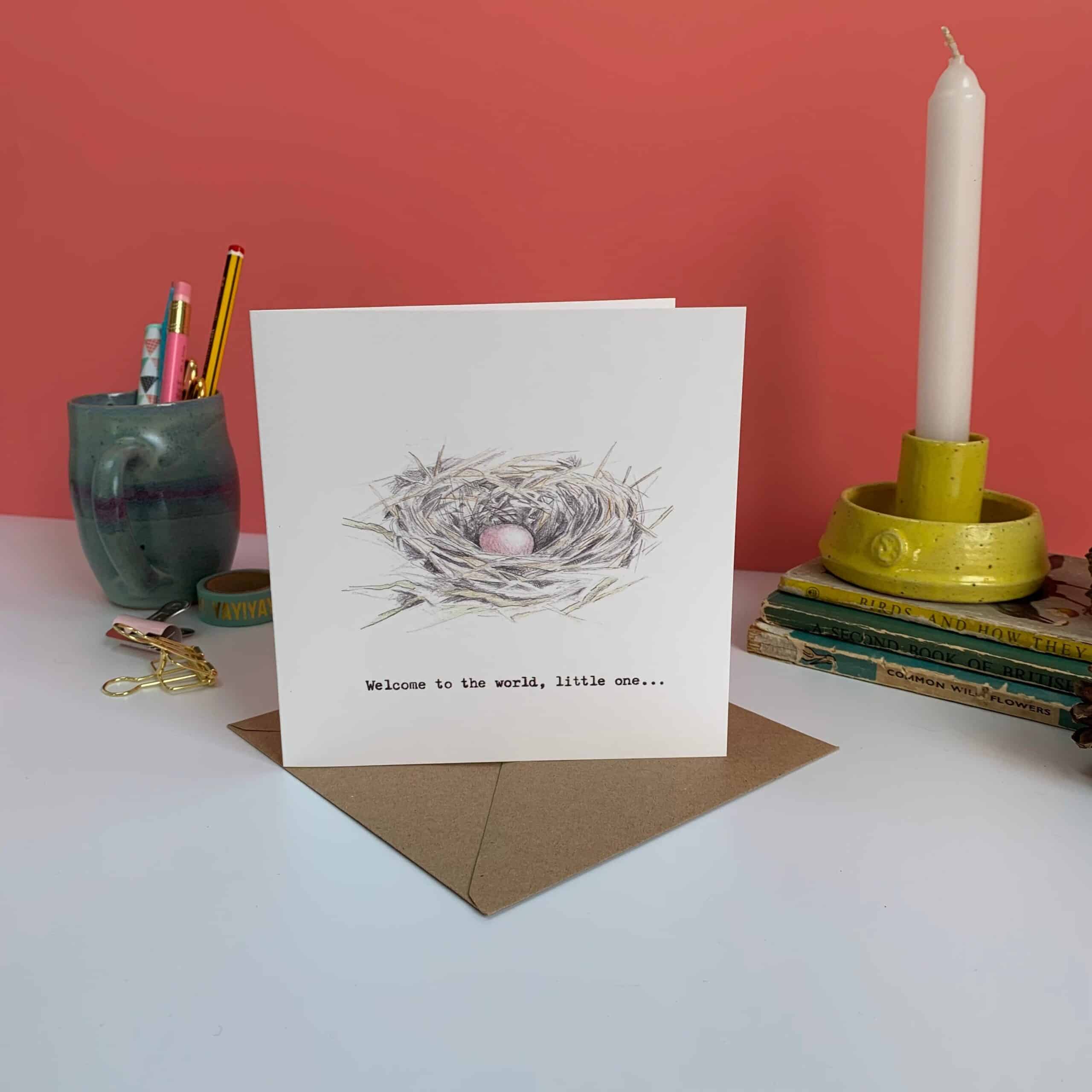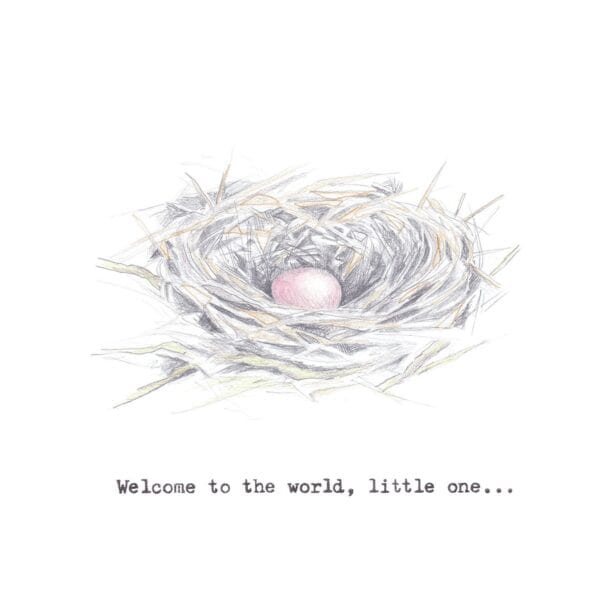 A pencil drawing of a tiny pink egg nestled within a birds nest. Inscribed with words ‘Welcome to the world, little one’ typed on my Mum’s typewriter.